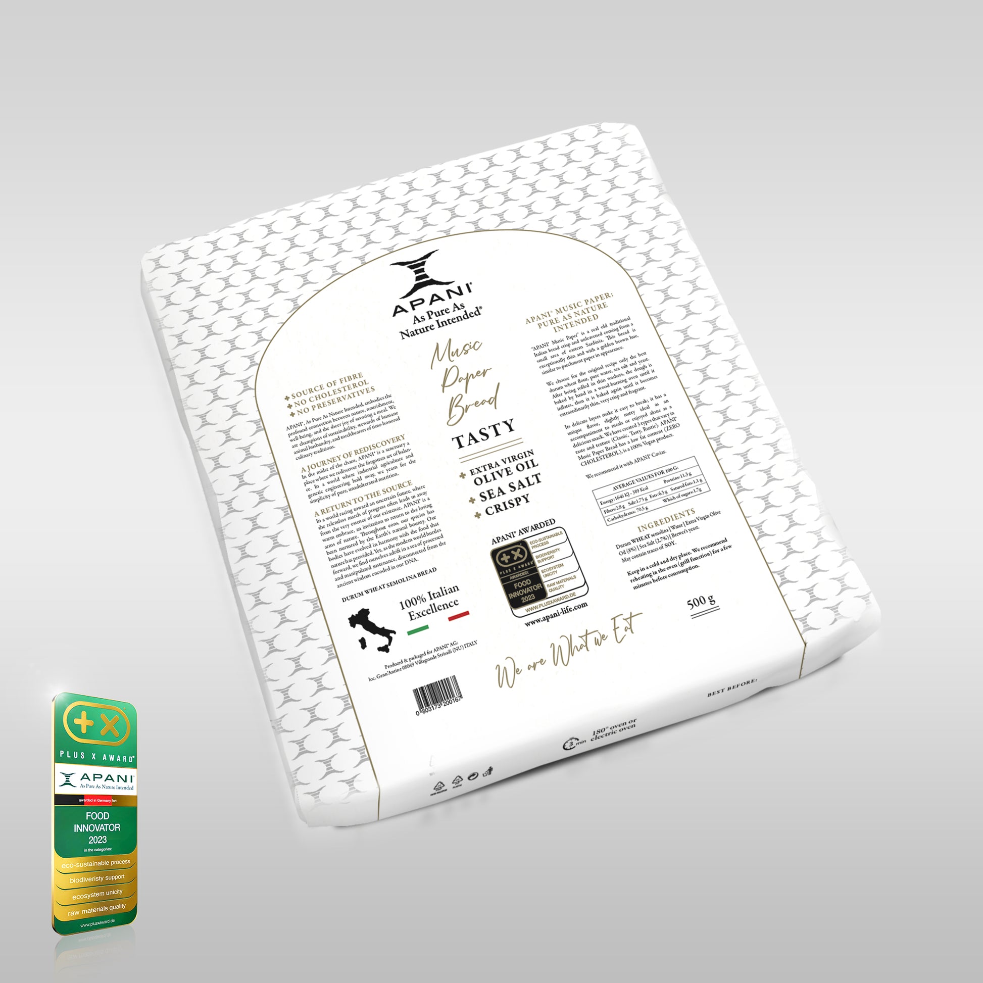 APANI® Music Paper Bread - Tasty is a traditional product of Sardinian cuisine, soaked with extra virgin olive oil and salted following the ancient recipe handed down from generation to generation it is then baked a second time to give it a light toasting: this process is the main difference from the Classic. APANI® Music Paper Bread - Tasty version - boasts a distinctive texture and rich flavor that make it a versatile addition to your culinary repertoire. Whether you pair it with traditional dishes or use it as a base for your own creations, it elevates any dining experience: try it as an accompaniment to fresh and aged cured meats and cheeses or as an appetizer or at a holiday buffet. APANI® Music Paper Bread - Tasty version - is a satisfying crunch in every bite.